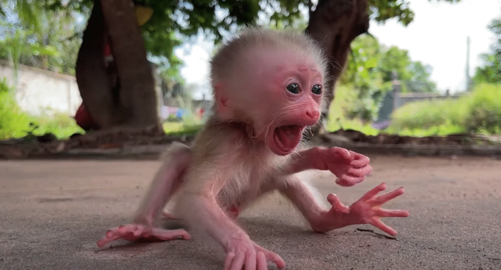 Little baby monkey A Tong was not in the mood to walk. His tiny legs were tired, and he only wanted to cuddle in his mommy’s arms. But today, Mama Monkey was not in the mood for baby behavior. She seemed upset—her face serious, her movements quick and firm. She pulled A Tong gently but firmly by the arm, encouraging him to stand up and walk.