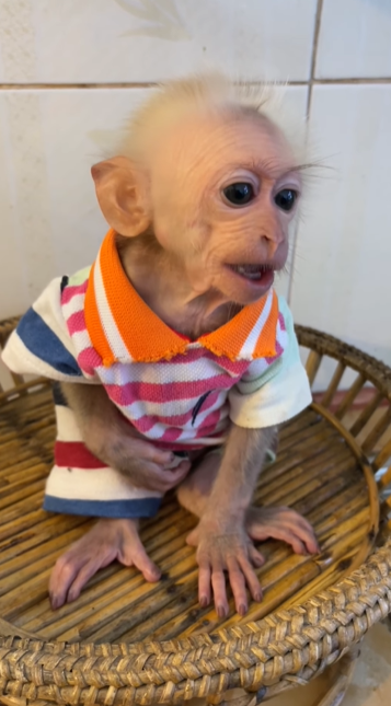 Adorable Baby TanTan sitting quietly while waiting for mom to clean the home is a moment filled with tenderness and patience. With his small body settled in one spot, Monkey TanTan looks calm and obedient, as if he understands that mom is busy nearby. His little hands rest gently on his lap or lightly hold onto a cloth, giving him comfort as he waits. There is something deeply touching about how still and cooperative he is, showing trust and understanding far beyond his tiny size.