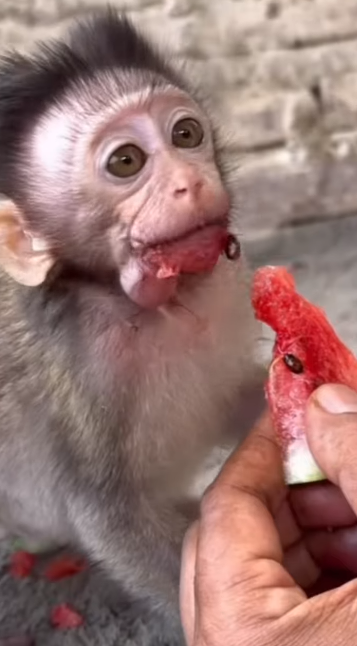 Baby Mimi had found the perfect slice of watermelon, bright red and juicy, glistening in the warm afternoon light. The moment it touched her tiny hands, her eyes widened with excitement. She loved watermelon more than anything, especially when it was fresh and sweet. But today, something felt different. Mimi didn’t eat slowly like she usually did. Instead, she started nibbling fast, cheeks puffing as she chewed in a hurry, her little fingers gripping the fruit tightly 😳.