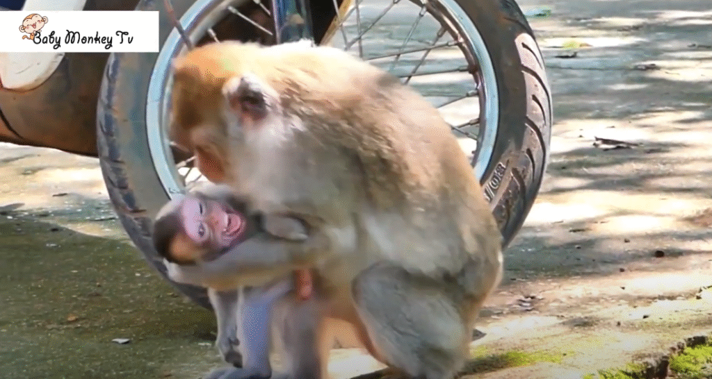 A baby monkey, full of wild emotions, suddenly lost his temper after his mother refused to let him play near the busy road. In a fit of frustration, he screamed, threw himself onto the ground, and then dashed toward a parked motorbike nearby. Before anyone could stop him, he slipped under and squeezed himself right into the tight space between the spokes of the wheel.