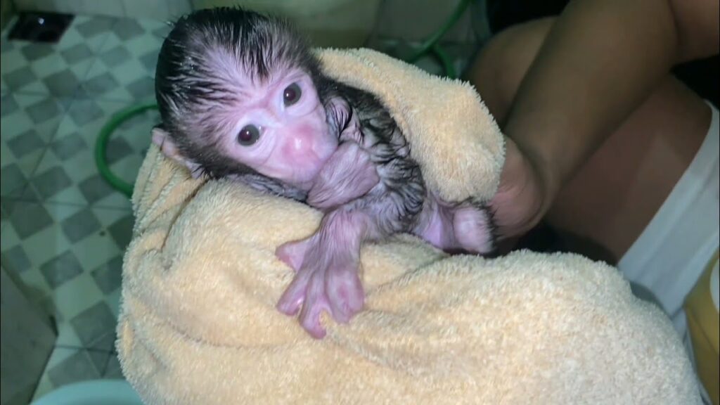 After the bath, Dad wraps Loui in a soft towel and gently dries his shiny fur. The once sticky and smelly baby monkey now smells fresh and looks even more adorable. Loui snuggles close, feeling warm, clean, and happy. He lets out a tiny yawn, his eyes closing in contentment.