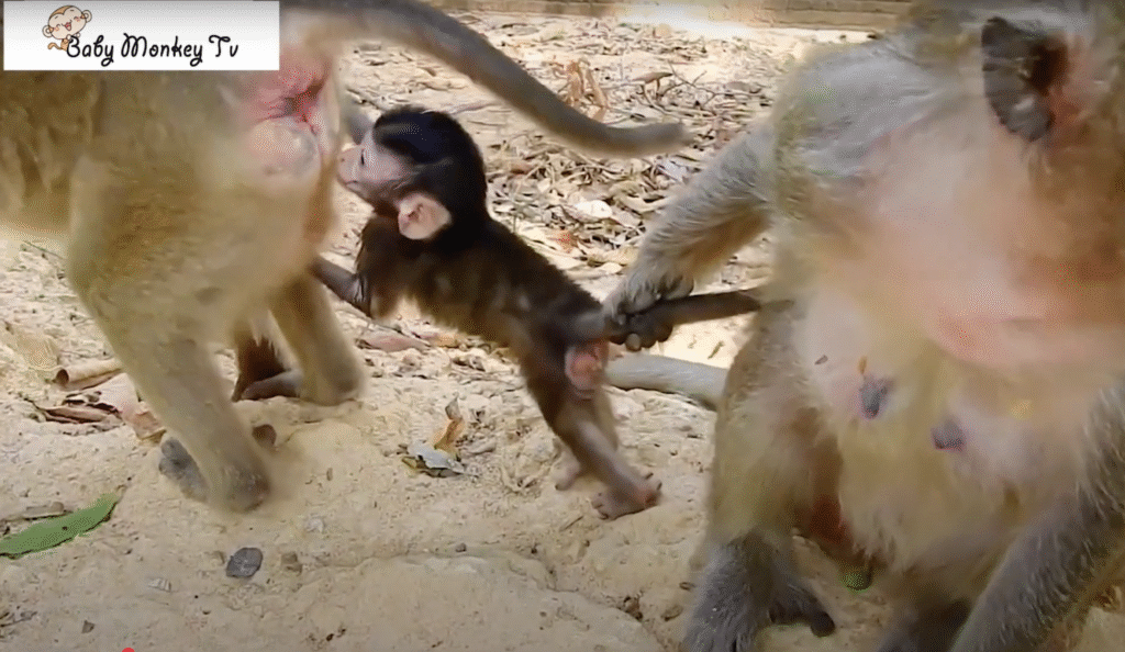 In the peaceful warmth of a sunny afternoon, a heartbreaking scene suddenly unfolded. A tiny baby monkey, just learning to crawl and explore, was playing near his mother under the trees. Innocent and unaware of danger, he strayed just a little too far. In a flash, a bad-tempered, jealous monkey from another group swooped in and snatched the baby away.
