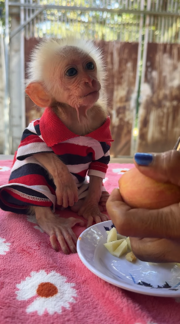 Baby TanTan let out a louder cry, calling for help in the only way he knew how. His body leaned forward, weak and dramatic, as if all his energy had been stolen by hunger. The sadness on his face could melt any heart. He wasnβt angryβjust tired, confused, and desperately craving apple fruits.