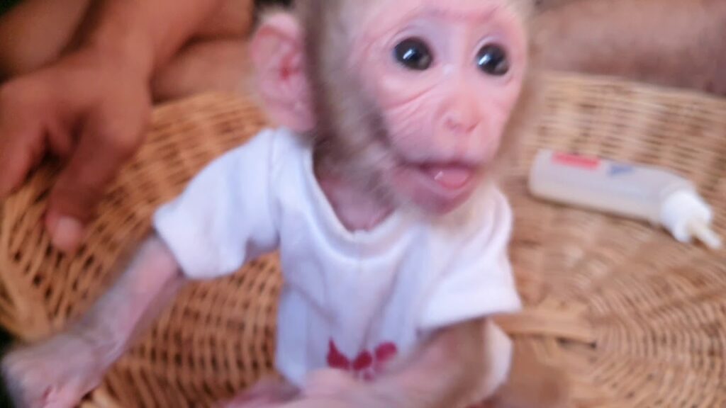 Papa adjusts the sleeves and makes sure everything fits just right. “Now my little boy looks handsome!” he seems to say through his cheerful expression. Aba jumps playfully, twirling around and showing off his new outfit as if he knows he looks special. The other monkeys nearby glance over, admiring how cute the little one looks in his bright new clothes.
