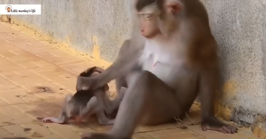 In this moment, the mother monkey shows remarkable patience. She tries to encourage her big baby to eat other foods, nudging it toward fruits and soft pieces that can fill its tummy. Yet the baby’s reaction is the same—it cries, clings tightly, and demands milk like before. The loud cries, constant pulling, and endless insistence combine into reactions that truly test the mother’s tolerance.