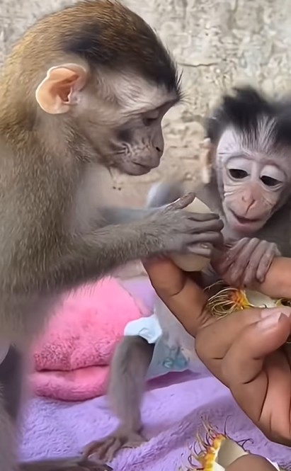Normally, baby monkeys might fuss and push each other aside, but not Cici. She watched Yumi bounce in anticipation and simply smiled with her soft, maternal calmness. Instead of taking the first bite — though she was clearly hungry too — she gently pushed the bowl closer to Yumi and sat back with her arms relaxed. It was her way of saying, “Go ahead, little one. You eat first.” 🥺❤️