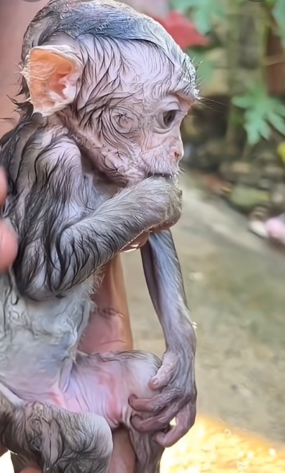 As soon as the water is ready, Mimi’s tiny body stiffens just a little. She isn’t scared of the bath itself—she just needs reassurance. The moment she’s held close, her eyes lock onto her caregiver’s face, wide and serious, as if silently saying, “Please don’t leave me.” Every time the gaze shifts away for even a second, Mimi reacts instantly, letting out soft protests and tightening her grip.