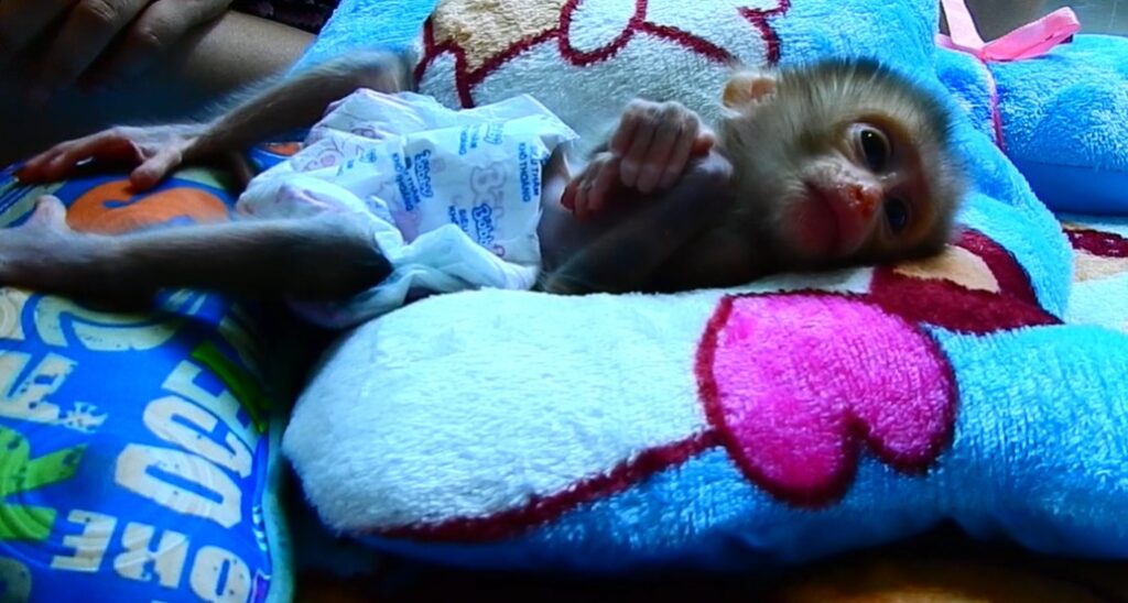 It was the very first morning of Baby Dody’s life, a moment both fragile and precious. The little monkey, still wrapped in the warmth of new beginnings, lay down on a soft, fluffy pillow. His tiny body looked so weak, almost weightless, as if even the gentle air could carry him away. His eyes were still half-closed, his breathing slow and careful — every rise and fall of his chest a small miracle. The world was still too big for him, and he seemed lost in its vastness.