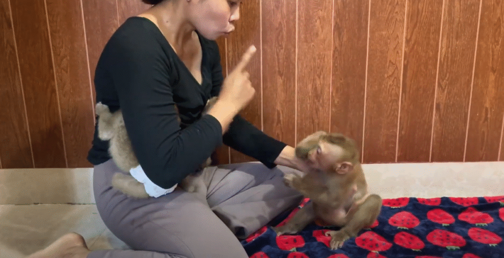His mom looked down at him gently, stroking his back as he leaned on her leg. She understood—he was still innocent, still learning about the big world around him. She offered him a piece of soft banana in her hand, but TanTan didn’t reach for it. He just leaned his head against her fingers, needing comfort more than food.