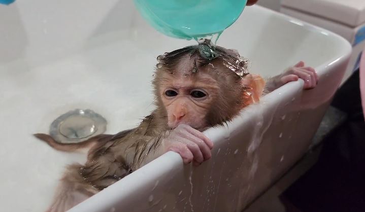 Papa carefully washes her small body, making sure she is safe and comfortable. The water is warm and soothing, and Little Monkey smiles sweetly as she feels the gentle touch. Sometimes she makes cute sounds, as if she is talking and saying thank you. Cleaning her body every day keeps her healthy, soft, and happy. It is not just about being clean, but also about love and care from Papa.
