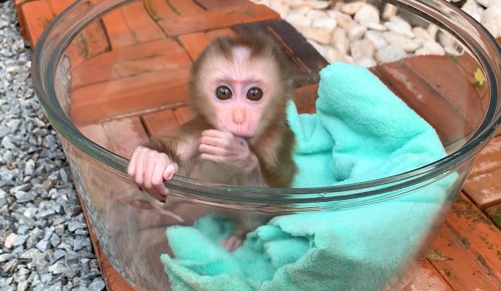 After a few minutes, papa finally arrives with a gentle smile. The little monkey becomes very happy, moving her body with joy. Papa carefully picks her up and slowly places her into the glass water tub. The water is clean and just the right temperature, making the little monkey feel comfortable and relaxed.