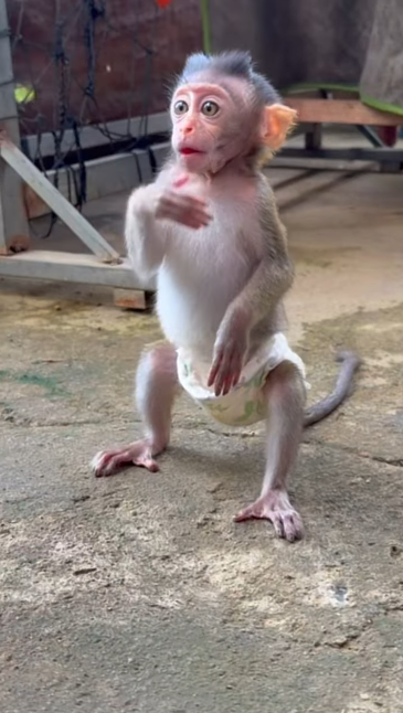 It was one of those heart-melting moments that made everyone stop and smile. Baby Monkey Mimi waddled toward me slowly, tiny feet padding softly on the floor. Then she paused, looked up with her big, round eyes, and planted herself right in front of me 🥹🐒. There was no doubt—this little monkey was asking to be held.