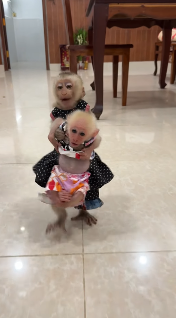 The afternoon sun was slowly slipping behind the trees, casting long, gentle shadows across the little monkey family’s play area. Baby TanTan had been running around outside, tumbling over leaves and tiny twigs, squealing with excitement. His little legs were tired, and a faint frown had appeared on his tiny face. Marry noticed immediately. With a soft, understanding smile, she crouched down and opened her arms. TanTan, recognizing the warmth and comfort of her embrace, ran straight into her hug, wrapping his tiny arms around her neck.