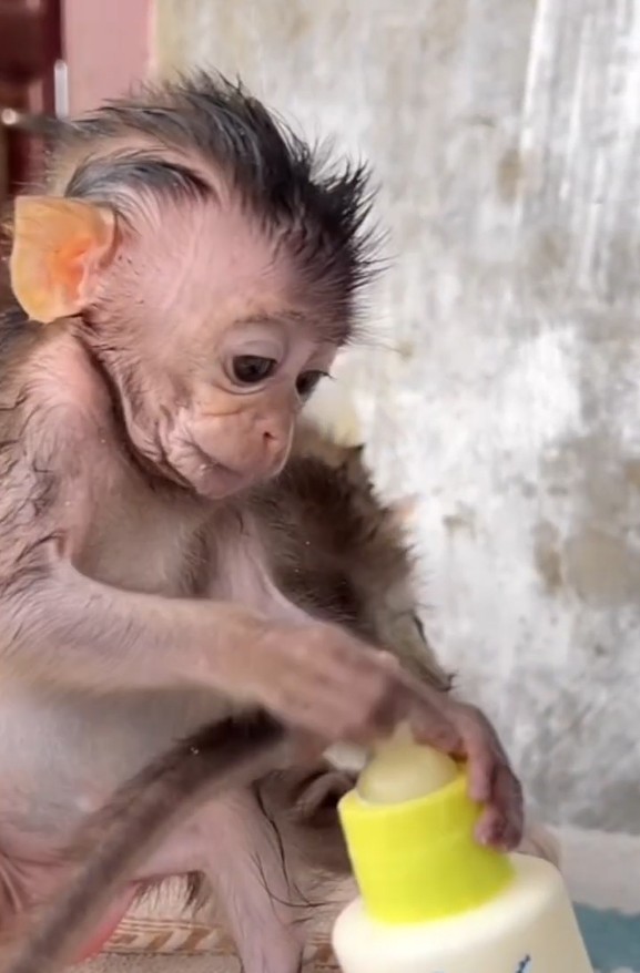 Mimi inched closer, moving with surprising stealth for such a tiny baby monkey. She peeked from behind, tilting her head just enough to keep the bottle in view. Every small movement was careful, as if she didnโt want to be noticed. Her eyes sparkled with curiosity and mischief, and her tiny fingers twitched, eager to grab what she wanted.