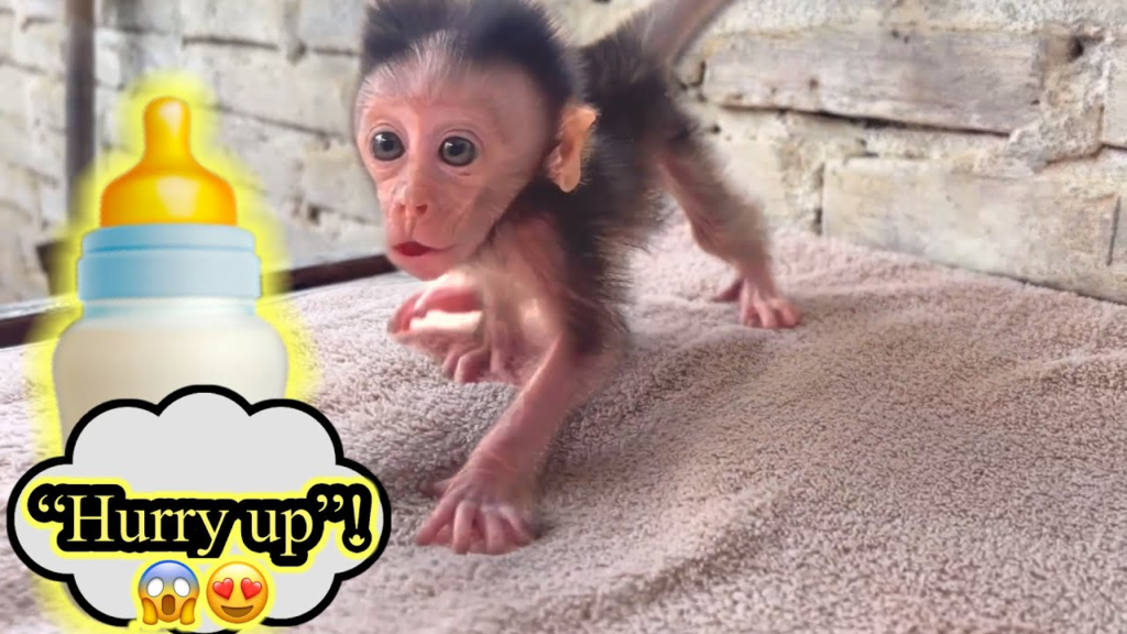 Milk time is always an exciting moment, and today Baby Monkey Mimi doesn’t waste a second 🍼🐒. The moment she hears the familiar sound of preparation, her tiny feet scramble, and she rushes forward with pure excitement. Her little arms stretch out, reaching for the milk as if she can’t wait even one more second.