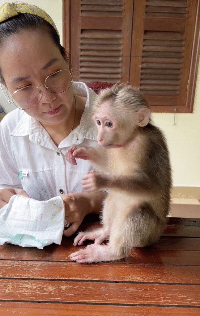 Early in the calm morning, the soft sunlight slips gently through the leaves as Mom prepares a clean diaper for little Pavpav, the playful baby monkey. The air feels warm and peaceful, and Pavpav sits on his soft blanket, wiggling with excitement. He knows that Mom is about to take care of him, and even though he doesn’t fully understand the process, he enjoys every moment when he receives her gentle attention.