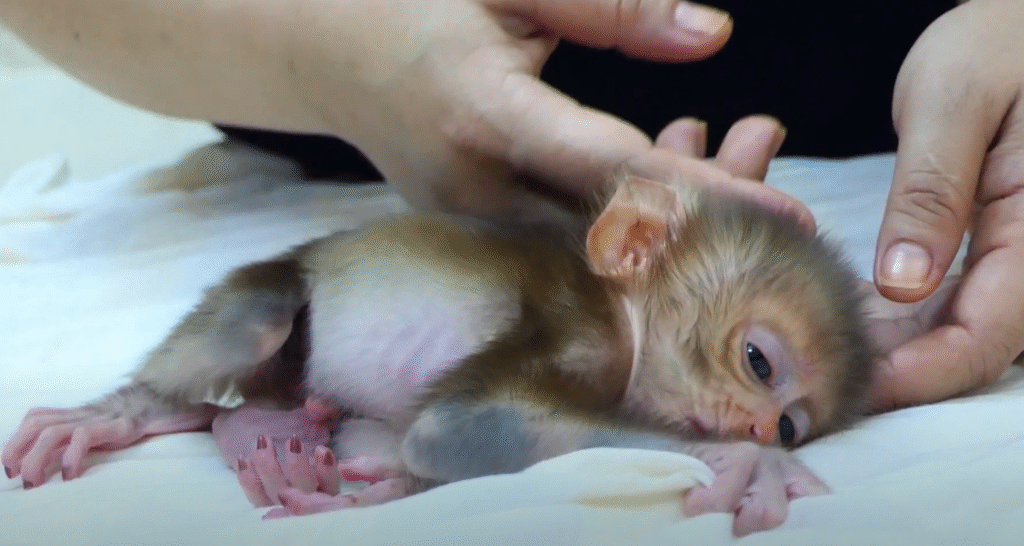 The scene was heartbreaking from the very first moment. The newborn baby monkey, so tiny and fragile, arrived at the new home in a state of extreme weakness. His little body trembled with exhaustion, and his eyes barely opened as he lay motionless in a soft blanket. His fur was thin, and his skin looked pale—clearly showing signs of dehydration and lack of warmth. It was clear he had been through a lot in his first few hours of life.