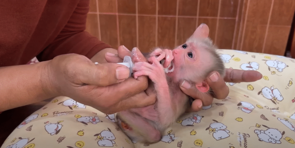 Feeding time was the hardest. The baby was too weak to suck properly, and every drop of milk took effort. But the caregiver didn’t give up. Slowly and patiently, she fed the baby with a small syringe, careful not to overwhelm it. After a while, the baby’s eyes started to blink more, and a soft little breath of relief escaped its lips.