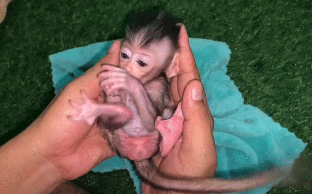 The newborn baby monkey, with his soft pink face and big round eyes full of emotion, had been crying non-stop since morning. His little hands reached out in the air as he squeaked and whimpered, clearly overwhelmed by the strange world around him. Everything was new—the smells, the sounds, the touch of his mother’s fur. He missed the warm, quiet comfort of the womb.