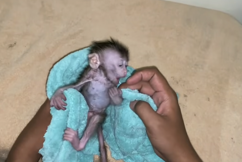 The baby monkey had been waiting for food and comfort, and like many little animals, patience is not easy at such a young age. The moment the bottle or meal was being prepared, the baby monkey started reaching out with its tiny hands, making quick movements, and calling loudly as if saying, “Hurry, please!” Its bright eyes were wide with anticipation, and its small body wiggled with excitement, unable to stay still even for a moment.