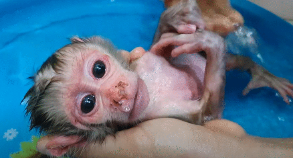 Little Aba, a newborn orphan monkey, had just arrived at his new home—tiny, weak, and scared of everything around him. His soft cries filled the quiet room as he clung tightly to a small cloth, his body still adjusting to the sudden change in his world. Today was an important day for him—his very first bath.