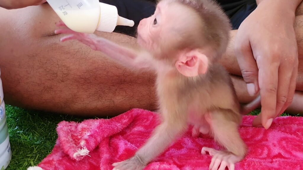 When Papa walked toward Aba holding the milk bottle, the little monkey’s eyes lit up immediately. His tiny hands reached out with excitement, his mouth already opening in anticipation. Aba knew what was coming — his delicious meal! Papa smiled warmly and gently handed the bottle to him. To everyone’s surprise, little Aba grabbed it tightly with both hands, showing how clever and strong he had become.