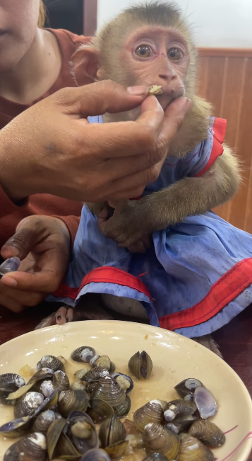 Poor Marrya doesn’t want to eat oyster, and Monkey TanTan’s world feels a little sad in this moment. When the oyster is placed near her, Marrya looks at it quietly, her face unsure and hesitant. She doesn’t reach out like she usually does with her favorite foods. Instead, she sits still, her small hands close to her body, clearly not interested.