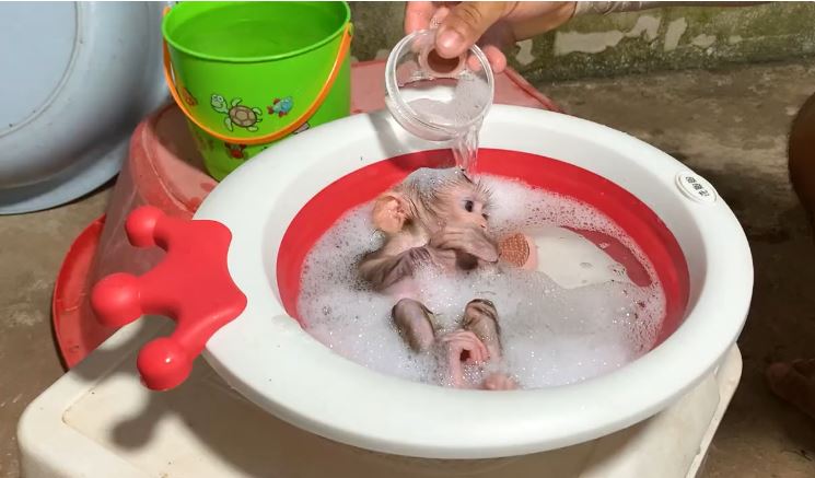 The little puppy monkey is having a joyful and heartwarming day filled with love, care, and happiness. Early in the morning, she wakes up feeling playful and excited, ready to enjoy every moment with her loving papa. Her tiny hands clap softly as she sees the warm water being prepared, knowing that it is time for her favorite activity—bath time.