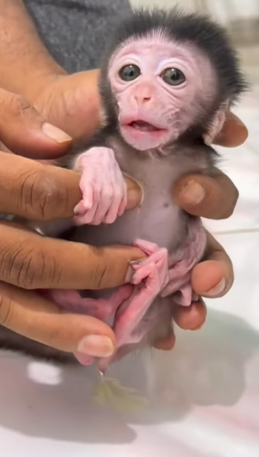 At first, the tiny monkey froze. Her wide eyes blinked rapidly as if trying to understand what had happened. A soft squeak escaped her lips, expressing confusion, embarrassment, and a hint of fear all at once. Her tiny body trembled slightly, and she tucked her little paws close, unsure how to respond. For a moment, it seemed as if the small accident had turned the world upside down for her.