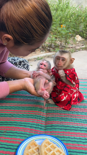So beautiful Baby Sangha sat quietly in Sis Marry’s loving arms, making the whole place feel warm and peaceful. Monkey TanTan watched from nearby and smiled, because the moment was full of gentle love. Baby Sangha’s soft face and bright eyes made everyone stop and look. He was small, sweet, and very calm, like a little dream.