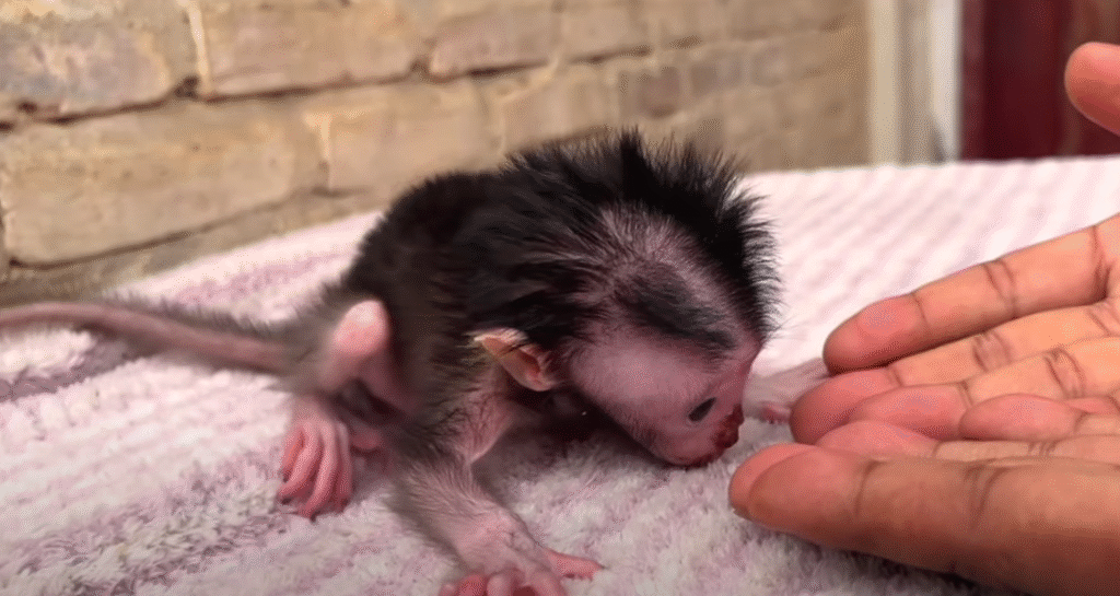So small, so fragile, and yet carrying a weight far too heavy for such a tiny life—this little baby monkey’s story is one of loss, hope, and the search for love. Alone and trembling, he doesn’t understand why his mother isn’t there to comfort him. His tiny hands stretch outward, reaching for warmth, for care, for someone to answer his silent cries. Every movement is filled with desperation, a tender reminder of how much even the smallest soul needs connection.