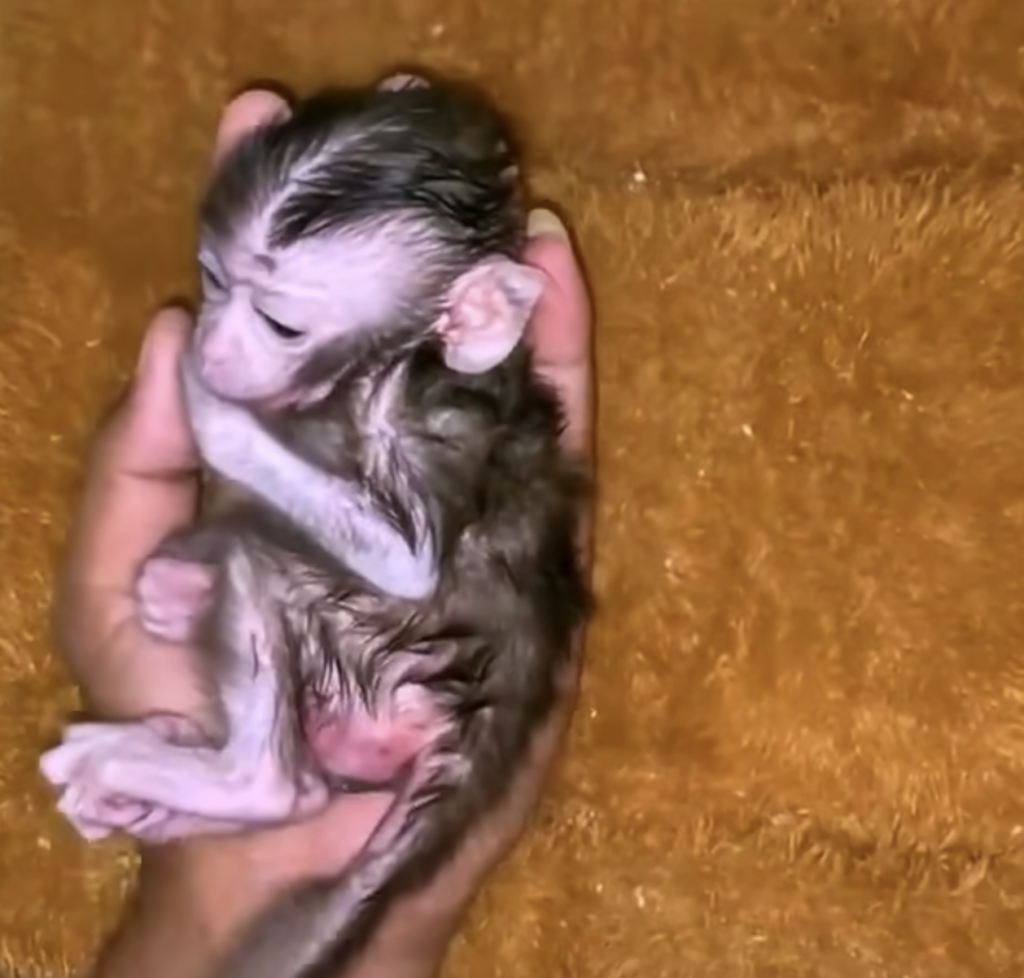 After being gently bathed, the little monkey begins to look calmer. The warm water helps clean the dirt from its small body and brings a bit of relief. Wrapped carefully to stay warm, the baby slowly relaxes, though its weakness is still clear. Its eyes remain half open, and every movement shows how hungry and tired it truly is.