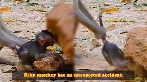 The baby monkey was playing peacefully when an unexpected accident suddenly changed everything. Curious and energetic, the little monkey moved around its surroundings without understanding the dangers nearby. It stayed close to the ground, exploring with innocent excitement. Then, without warning, a rock fell from above and struck the baby monkey on the head. The sudden impact shocked everyone nearby and left the tiny animal frightened and confused.