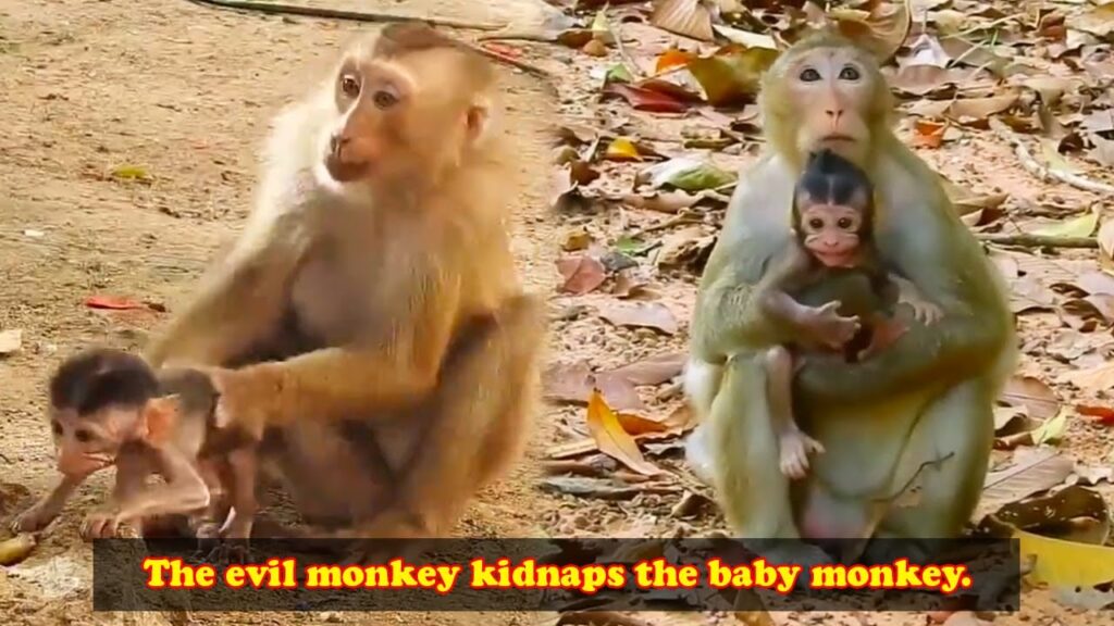 The baby monkey found itself in a frightening situation after being caught by a larger monkey. Small, weak, and unable to escape easily, the tiny monkey appeared overwhelmed by fear. The larger monkey held onto it firmly, creating a tense and emotional moment. Feeling trapped and helpless, the baby monkey began making loud whistling sounds, seemingly calling out for help and protection.