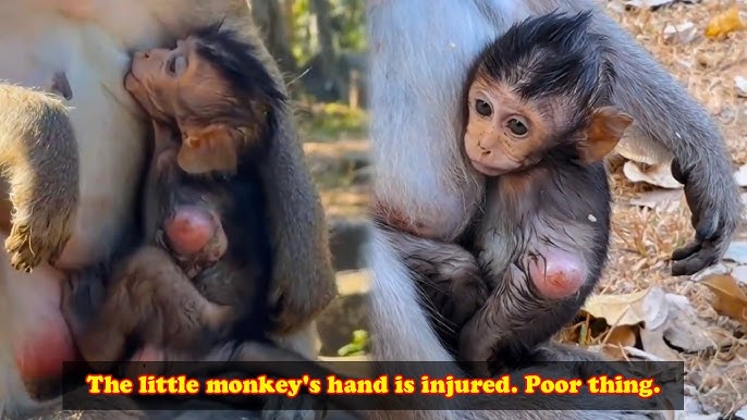 Despite the seriousness of the injury, the baby monkey was not alone. Its mother stayed close every moment, refusing to leave her little one behind. She carefully watched over the baby, keeping it warm and protected from danger. Whenever the baby cried, the mother monkey gently touched it, trying to calm its fear and discomfort. Her presence became a source of comfort during a painful time.