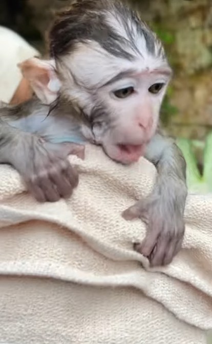 Still slightly wet from the bath, Cici clung tightly, her tiny hands gripping with surprising strength. She kicked her little feet and leaned away from the towel, as if it were something truly frightening. Her face showed pure shock and confusion. To her, the towel wasnโt soft and comfortingโit was an unknown object that suddenly came too close.