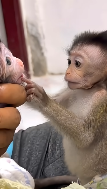 The baby monkey moves closer carefully, as if she knows how delicate the newborn is. She doesn’t grab or pull. She simply watches, head tilted, eyes soft. When the newborn makes a small sound, the baby monkey responds by leaning in, offering warmth and comfort. It’s a quiet moment, but one filled with meaning.