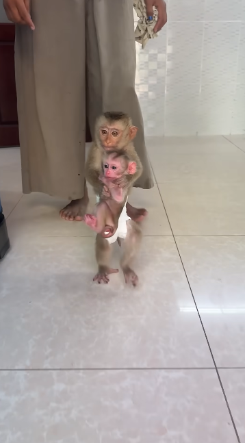 Marry holds Baby Sangha close to her chest, supporting his tiny body with care. Baby Sangha relaxes in her arms, trusting her completely. His small hands gently hold onto Marry, and his face becomes peaceful. This shows how smart Marry is—she knows that Baby Sangha needs comfort more than anything else at that moment.