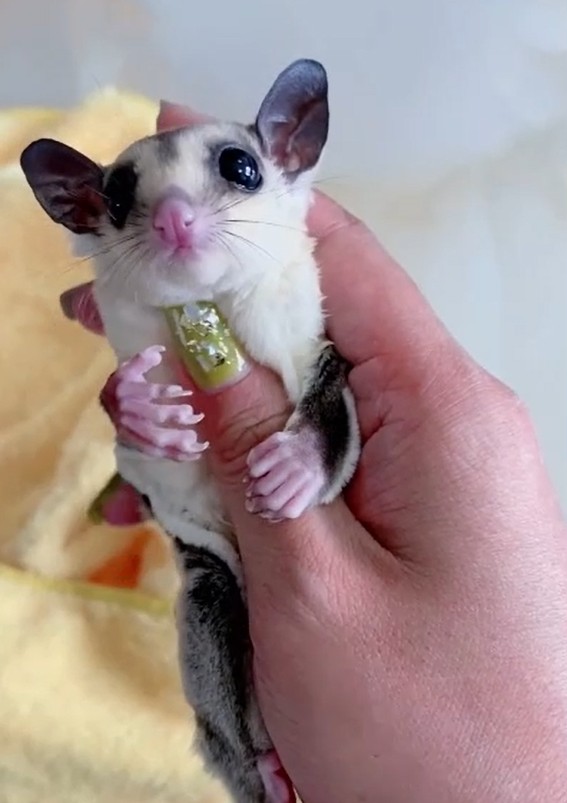 In this playful scene, the sugar glider seems to be sharing something precious — maybe it saw a “mother honey bee” taking a bath in a water bowl, or maybe it’s just its way of showing love and attention. Sugar gliders are social animals who love interaction, whether it’s with other gliders or with their human companions. When they bond deeply, they’ll often act as if they’re part of your everyday life — watching, waiting, even “helping” in their own funny way.
