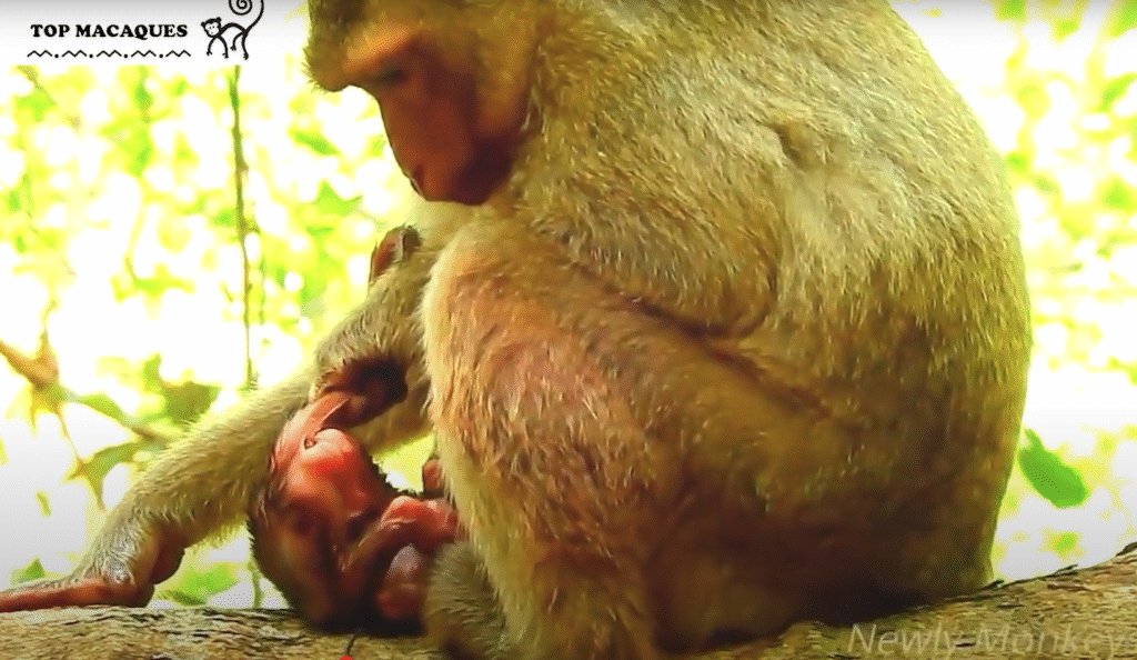 In the quiet morning deep in the forest, a young mother monkey gave birth for the very first time. Her body trembled with exhaustion, and her eyes looked around in confusion. The tiny newborn lay beside her, soft, pink, and helpless—crying out for warmth, comfort, and milk.