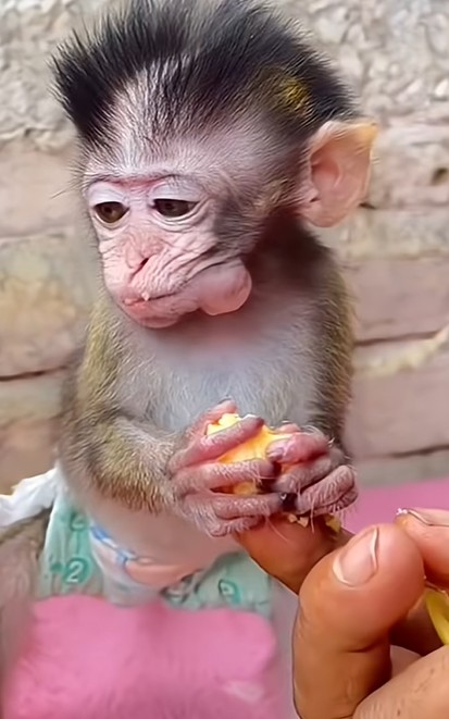 Baby Monkey Cici sat close by, watching attentively. She made sure Yumi was comfortable and safe, gently adjusting the banana when it slipped. Cici looked proud, almost amused, as Yumiโs face went through a whole range of emotionsโdelight, focus, surprise, and deep contentment. It was a simple moment, but full of love.